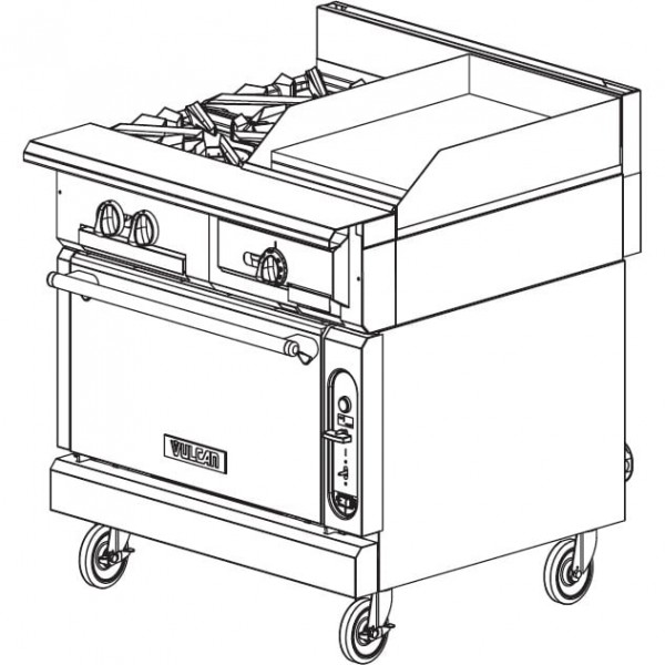 The V2BG8TS is the heavy-duty V Series 36" wide gas-powered open burner / griddle range from Vulcan that has a Standard oven base, thermostatic controls, and a 3/4" thick ground steel 18" wide griddle plate, and 2 cast iron open burners with individual pilots and controls. This oven base range stands firmly on 6" adjustable stainless steel legs.