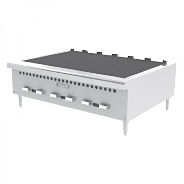 The VCRB36 is the Restaurant series 36" wide countertop 6-burner heavy-duty gas charbroiler from Vulcan with 14,500 BTU cast iron burners with individual infinite heat controls and a full-width front grease drawer. This countertop commercial gas charbroiler stands firmly on a set of 4" adjustable legs.