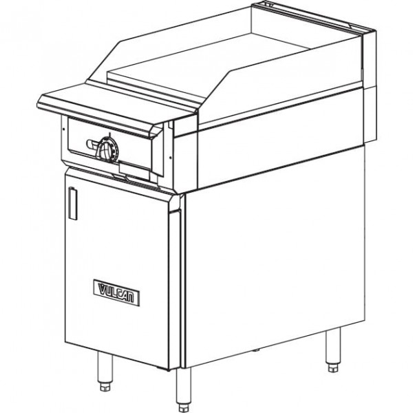 The VGT18 is the heavy-duty V Series gas-powered griddle range from Vulcan that has a modular frame, thermostatic controls, and a 3/4" thick polished steel 18" wide griddle plate with 4" side splashes, and individual pilots and controls. This modular range comes without legs.
