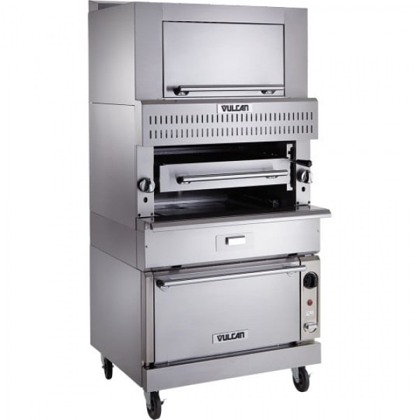 - V Series heavy-duty 36" wide double-deck broiler with finishing oven