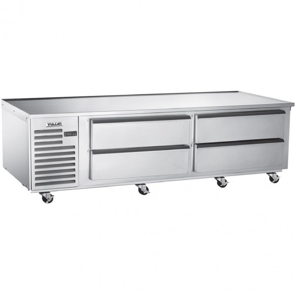 The VR96 is the VR series flat top 96" wide remote-cooled refrigerated base from Vulcan with 6 drawers that each holds up to 2 full-size 12" x 20" x 6" deep pans for a total 12-pan capacity. The unit rolls smoothly on 4" heavy-duty casters.