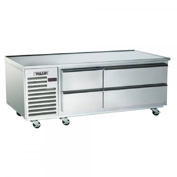There is a side-mounted, balanced, self-contained refrigeration system on this base unit that operates with R-404 refrigerant and the unit features a rear-mounted evaporator that circulates cold air through each drawer compartment.