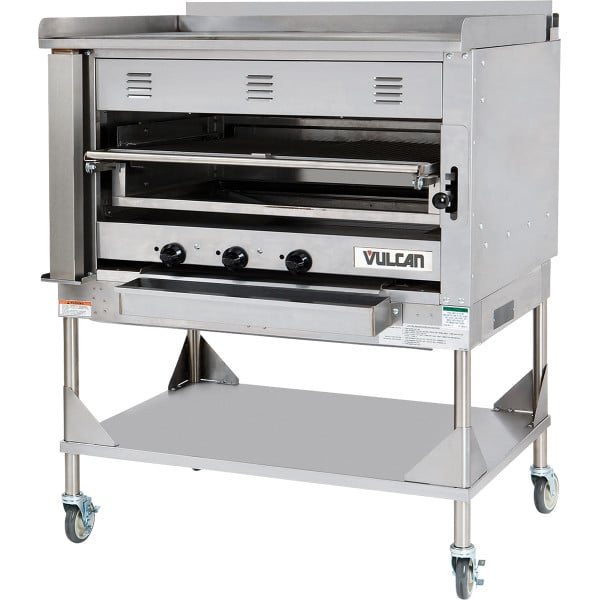 Vulcan VST4B Liquid Propane V Series 45 1/2" Wide Deck-Type 3 Cast Iron Burner Heavy-Duty Stainless Steel Chophouse Broiler With 1/2" Thick Griddle Plate On Casters, 135,000 BTU