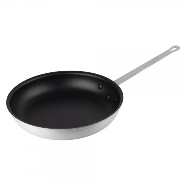 Fry, sear, scramble, and saute all of your signature dishes in the versatile AFP-14NS 14" aluminum fry pan. This 14" diameter fry pan has a sturdy aluminum construction, making it a great fry pan to keep in your busy kitchen. The non-stick coating makes clean-up fast and keeps food particles from burning on the pan surface. The handle is riveted to the pan body at three points providing a sturdy, durable connection that won't come loose or break over time.