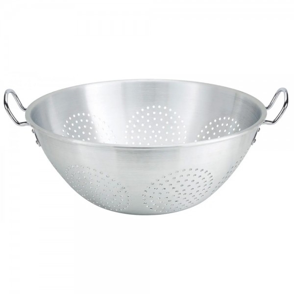 The Winco ALO-16H is an aluminum colander with a capacity of 16 quarts. Not only are the 4.5 mm holes ideal for straining pasta and rice, but this versatile colander can also be used for rinsing larger fruits and vegetables. The round, baseless design allows this colander to be used for more diverse purposes, such as steaming vegetables over an open stock pot or straining yogurt and soft cheeses using a cheese cloth. Featuring two handles, this colander is easy to transport around the kitchen.