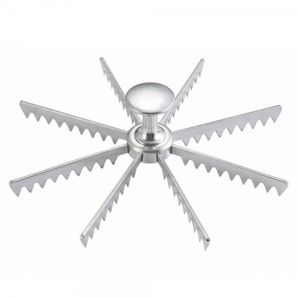 Whether used at a cafe, restaurant, or bakery, this tool will become a must-have for your dessert preparation needs. This pie cutter will guarantee to produce 8 beautiful, uniform slices each and every time. Each arm has nine teeth to clearly mark the cutting path.