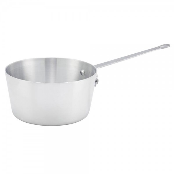 Primarily used for cooking soups and reducing sauces, this sauce pan is also great for boiling a small batch of pasta and deep frying foods. For added convenience, this sauce pan is built with a long, riveted handle for a secure and comfortable grip. This tapered sauce pan has sloped sides and rounded corners for easy stirring and cleaning. The aluminum encapsulated base allows even heat distribution making this sauce pan an indispensable versatile tool in every kitchen.