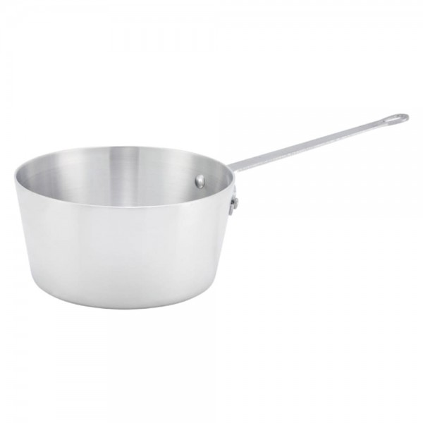 Primarily used for cooking soups and reducing sauces, this sauce pan is also great for boiling a small batch of pasta and deep frying foods. For added convenience, this sauce pan is built with a long, riveted handle for a secure and comfortable grip. This tapered sauce pan has sloped sides and rounded corners for easy stirring and cleaning. The aluminum encapsulated base allows even heat distribution making this sauce pan an indispensable versatile tool in every kitchen.