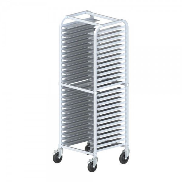 The Winco AWPR-26BK is a 26 tier pizza rack which comes fully assembled. Due to its welded aluminum heavy duty construction, the rack is extremely durable and long lasting. Featuring open rack design, this pizza pan rack loads from both front and back sides and there is 2" spacing between each tier. The rack also has a maximum capacity of 800 pounds and is mobile on four 5" full-swivel casters.