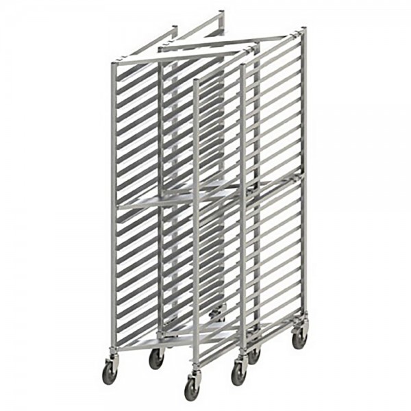 Designed with space-saving in mind, the Z-rack fits snugly with nesting racks to conserve floor space while in storage. The Z-rack accommodates standard full-size sheet pans, or double up with half-size pans. Combining durability and convenience, this sheet pan rack features an exceptionally durable aluminum structure and full-swivel casters with brake for easy transport. Perfect for use in restaurants and bakeries.