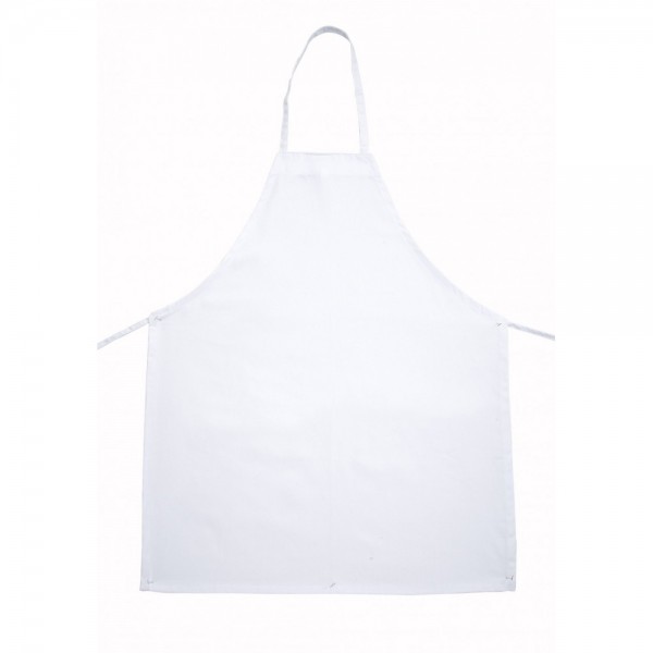 The BA-3226WH is the White 33" long x 26" wide, poly-cotton full-length bib apron from Winco's Signature Chef apparel collection that has no pockets.