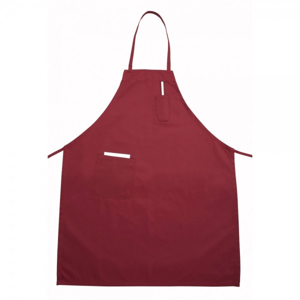 The BA-PBG is the Burgundy 33" long x 26" wide, poly-cotton full-length bib apron from Winco's Signature Chef apparel collection that has 2 pockets for pens and pads.