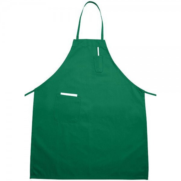 The bib apron is a 65/35 poly-cotton blend and it is wrinkle-resistant and machine washable.