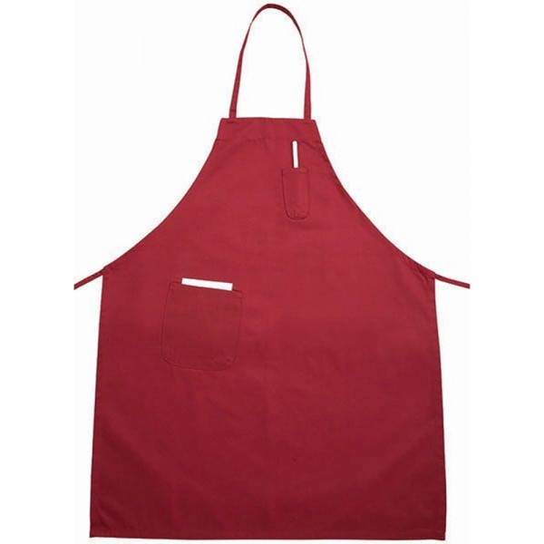 The BA-PRD is the Red 33" long x 26" wide, poly-cotton full-length bib apron from Winco's Signature Chef apparel collection that has 2 pockets for pens and pads.