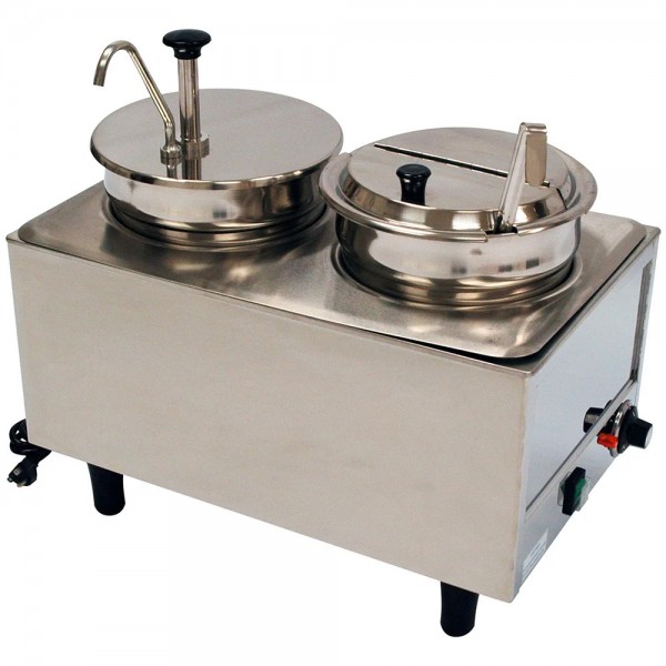 The Winco Benchmark 51073P food topping warmer is a countertop warmer with two slots for pans to be warmed. The wells are 7 quarts in size and there is the ability to control the temperature with an adjustable thermostat. This unit also has a hinged inset lid, along with a stainless steel pump. This gives you the option to have the customer pump out your hot fudge or caramel. This unit also comes with one long handled ladle.