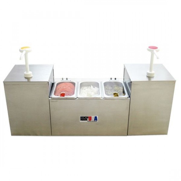 The Winco Benchmark 52001 is a condiment station with two pumps for more options, and these pumps are color coded. These pumps will accept #10 size cans, 1.5 gallon, or 3 qt. stainless steel jars. This unit also has three 4" deep 1/9-size pans that come included. There are two cold packs that also come included to keep your 3 pans cold, and the inset well is insulated.