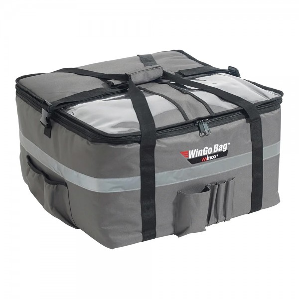 This Winco BGCB-2212 x-large premium catering WinGo bag is ideal for pizza boxes, food pans, and more. It will maintain the temperature for up to 45 minutes maximizing the delivery range. This catering bag features a transport strap made for a bike or scooter. The built-in rubber feet are great for long-lasting durability. Multiple heavy-duty carry straps are attached to stabilize the deliveries.