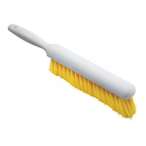 The BRC-14Y is a Counter Brush from Winco. The white handle/base of the brush is constructed of plastic. The synthetic bristles are made of polypropylene and feature a yellow color.