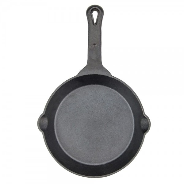 The CAST-8 is a FireIron 8 inch diameter round cast iron skillet from Winco. This model comes in a matte black finish and is pre-seasoned. The long widened handle with a thumb-rest makes transportation easy even while hot. Two built-in pour spouts on either side make pouring liquids out of the pan easier. Induction ready and compatible with multiple cooking surfaces. The skillet is also oven safe and hand wash only.