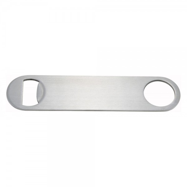Quickly uncap a bottle of beer, soda, or mineral water using this flat bottle opener. Thanks to its compact size, this bottle opener is great for parties, outdoor events, or fast-paced food service establishments. The convenient thumb hole can double as a hanging loop when not in use.
