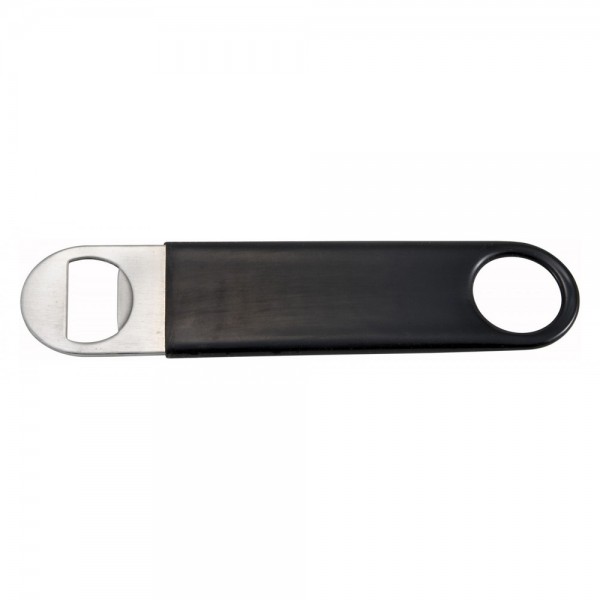 Quickly uncap a bottle of beer, soda, or mineral water using this flat bottle opener. Thanks to its compact size, this bottle opener is great for parties, outdoor events, or fast-paced food service establishments. The convenient thumb hole can double as a hanging loop when not in use.