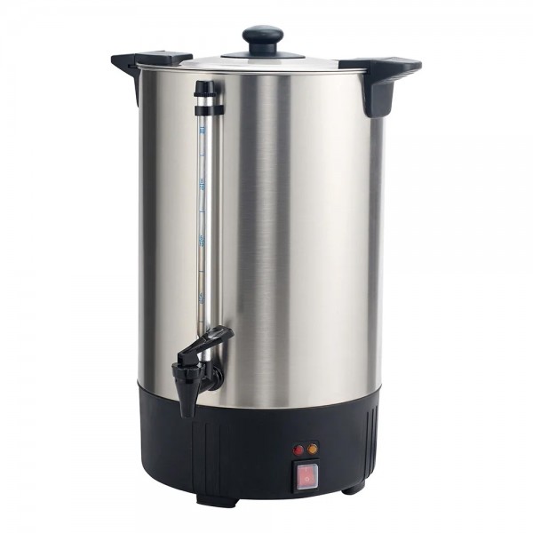 Winco, EWB-100A-I, Commercial Water Boiler, 100-Cup (16 liter/4.2 gal), twist-locking lid, cool touch handles, dripless faucet with protected level indicator, waterproof ON/OFF switch with protective cover, heating and holding indicator lights, automatic shut-off safety feature, 304 stainless steel, 2.25kW, 220-240v/50/60/1-ph, VDE, CE, cETLus