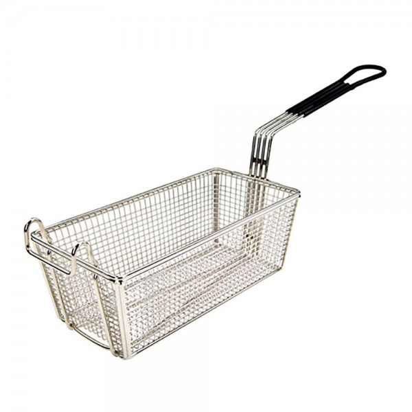 The twin fryer basket with front hook is made of 1.5mm thick heavy duty nickel plated wire, with a reinforced base for added durability. It comes with a front hook to hang basket above cooking area of fryer. Perfect for making french fries, chips, and mozzarella sticks.