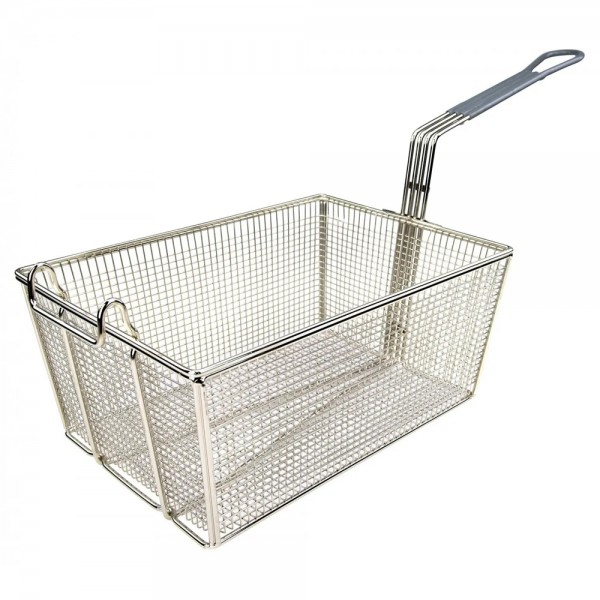 The twin fryer basket with front hook is made of 1.5mm thick heavy duty nickel plated wire, with a reinforced base for added durability. It comes with a front hook to hang basket above cooking area of fryer. Perfect for making french fries, chips, and mozzarella sticks.