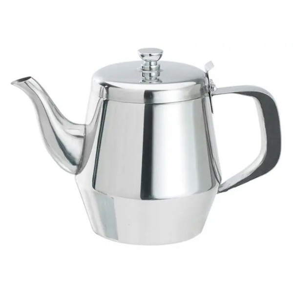 Serve guests and customers a comforting cup of tea with this stylish, stainless steel teapot. A sleek, classic welded gooseneck spout and mirror finish adds an upscale element and brings a unique look to your tabletop presentation. The hinged design keeps the lid connected to the unit so that it won't become misplaced, while the knob top is easy to lift for refills.