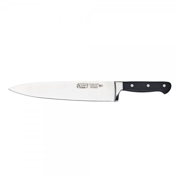 This chef knife is the most versatile cutting tool found in a commercial kitchen, and may be used to cut, slice, chop and mince. Thanks to its POM injection molded handle, this chef knife provides a balanced and comfortable grip to reduce hand fatigue from extended use. Built with a fully forged full tang X50 Cr MoV15 German blade, this chef knife is highly durable and provides excellent cutting performance.