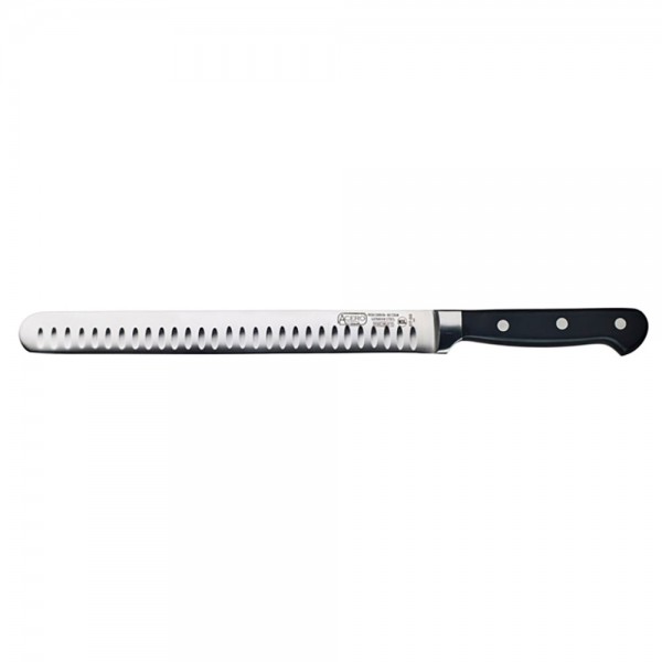 This 10" granton edge carving knife features a comfortable, high impact styrene riveted handle. Thanks to its granton edge, this slicer features grooves that fill with fat and juices to prevent meat from sticking to the blade.