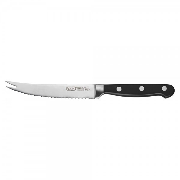 Designed with a serrated edge, this tomato knife easily cuts through tough skin while its forked tip allows you to conveniently lift and transfer tomato slices from the chopping board to a bowl. Thanks to its POM injection molded handle, this well-designed tomato knife fits comfortably in your hand, providing a well-balanced grip. Great for slicing and dicing fruits and vegetables.