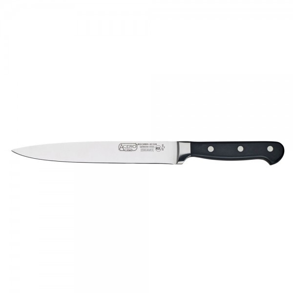 This fully forged full tang slicer knife boasts a durable X50 Cr MoV15 German steel blade for professional slicing. Built with an ergonomic POM injection molded handle, this slicer knife fits comfortably in your hand for balance and control. A great addition to any carving station at your restaurant or catered event.