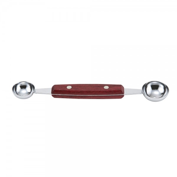The Winco MB-1 is a two sided melon baller. This model is constructed from stainless steel and features a wooden handle. The double-ended melon baller is designed to allow you to create 2 different ball sizes with the same tool. The small end is 1 inch in diameter and the larger end is 1-1/4 inches.