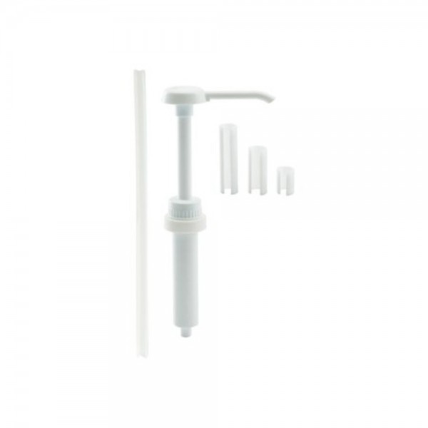The PKT-1 is a Pump Dispenser from Winco, designed for 1-Gallon Jugs. This white dispenser fits 1-1/2" caps. There are three restrictor sets for different dispensing options: 1/2 oz, 3/4 oz, and 1 oz. Each stroke provides 1/4 oz. This product can be used for either sanitary purposes, or as a condiment dispenser.