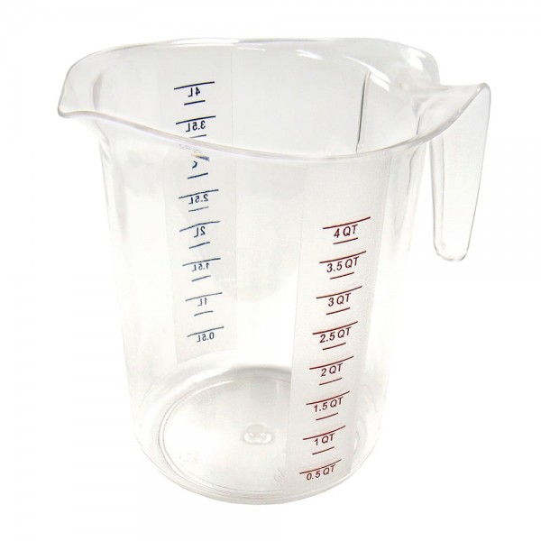 Easily measure out ingredients for all of your baking and cooking needs! The PMCP-400 by Winco is a durable polycarbonate measuring cup that can withstand drops and spills. This measuring cup has a capacity of 4 quart and features raised markings in quarts and liters. The measuring cup is heat resistant up to 210 degrees F so it can be used to measure hot liquids as well. This model is also dishwasher safe and NSF listed.