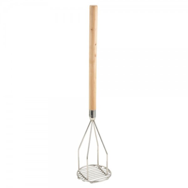 The Winco PTM-24R round potato masher is nickel-plated, heavy-duty enough to be used for all root vegetables. Built with versatility in mind this masher can be used for potatoes and other soft food like avocados and bananas. Thanks to its stainless steel construction, this potato masher is rust resistant and exceptionally durable. This model also features a wood handle for a comfortable grip.