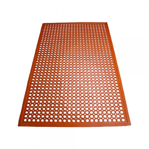 Designed with drainage holes, this floor mat ensures that liquid won't get trapped on top while its beveled edge provides traction. Thanks to its rubber construction, this anti-fatigue floor mat will endure heavy duty use. Place this floor mat in high traffic areas prone to food and drink spills to prevent dangerous slip and fall accidents.
