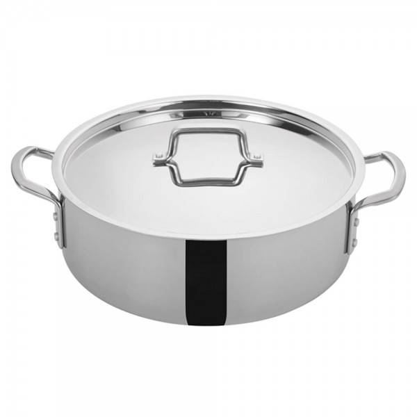 The TGBZ-14 is a brazier with a capacity of 14 quarts and a cover included. The bottom is tri-ply for even heating and cooking of contents. This model is oven safe up to 550 degrees Fahrenheit and can be used on a variety of cooktops including induction. The brazier is constructed from stainless steel with an aluminum core and a silver mirror finish exterior. There are wide loop riveted handles for easier handing of the brazier even when hot. This model is also NSF listed and dishwasher safe.