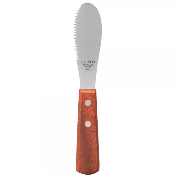 The Winco TN713 spreader is built with a rust-resistant stainless steel blade which will withstand heavy duty use while its rounded and serrated edge allows you to neatly slice through meat. For excellent balance and control, this sandwich spreader is built with a comfortable wooden handle. Great to use for spreading butter, jam, or cream cheese. This model is also dishwasher safe.