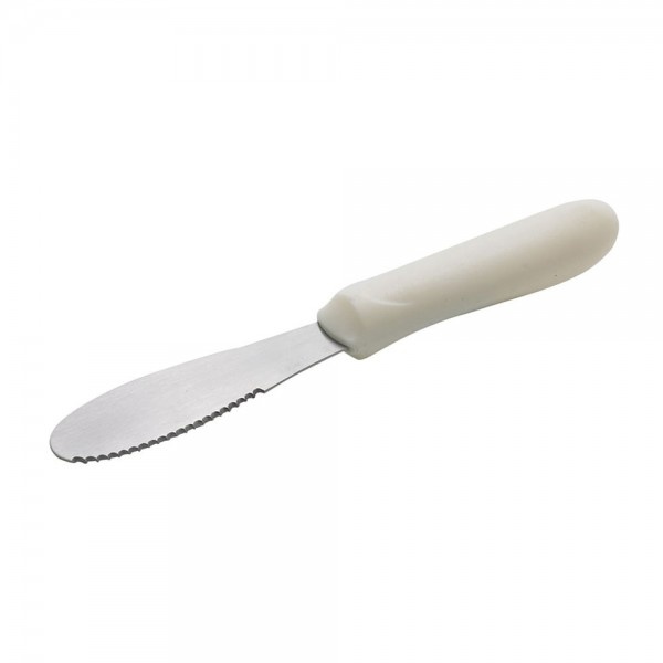 The Winco TWP-31 spreader is ideal for layering sweet and savory condiments on bread and pastry. Its durable stainless steel blade can withstand tough frequent use without the risk of bending or warping, and its slip-resistant polypropylene handle ensures convenient grip and hold. Use it as a substitute for a regular kitchen or table knife, as it has a larger spreading area and ensures a more thorough result. This model is also NSF listed and dishwasher safe.