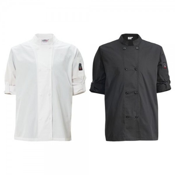 Part of the Signature Chef series, the UNF-12WXXL is an XXL White Chef Jacket from Winco. This jacket features roll-tab long sleeves and a left sleeve thermometer pocket. It is constructed of a lightweight 65/35 poly-cotton with a cool mesh panel back/side/underarm.