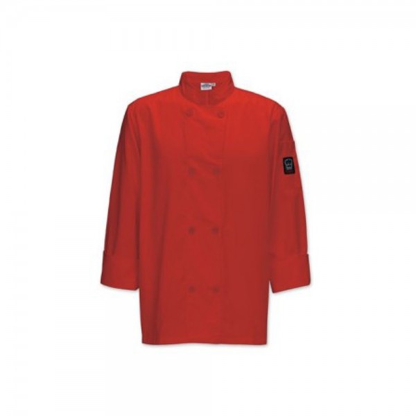 Part of the Signature Chef series, the UNF-6RL is a Large Chef Jacket from Winco. This red jacket is double breasted and features a thermometer/pen pocket. It is constructed of a 65/35 poly-cotton blend.