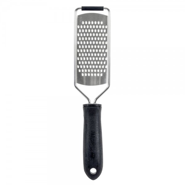 The Winco VP-311 is a 10" handheld grater with small 1.5mm holes. Thanks to an ergonomic black rubber handle and a durable stainless steel construction, this grater is capable of grating firm cheeses as well as a variety of other items. The wide cutting surface with 1.5mm holes allows for a quick and efficient grating process. Ideal to use to grate cinnamon sticks, chocolate, ginger, garlic, and vegetables. This model is also NSF listed and dishwasher safe.