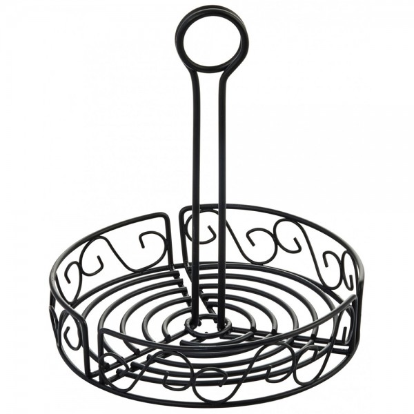 Featuring a convenient round shape, this professional kitchen device is crafted from metal wire decorated and durable classic black finish. Great for holding salt and pepper shakers, ketchup, mustard, and other condiments. The caddy is sure to fit on any table, and a special slotted top offers room for inserting a table number, menu card or daily specials.