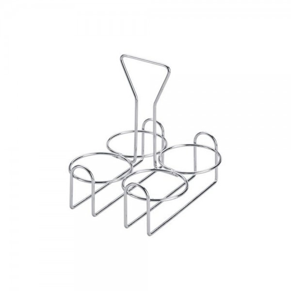 Designed to hold 4 jars, this holder provides guests easy access to condiments and spices while its bottom frame bar ensures stability. Made from chrome-plated wire, this condiment jar holder is easy to clean and will endure the demands of high volume service. Thanks to its loop handle, this condiment holder provides a comfortable grip when moving it from one table to another.