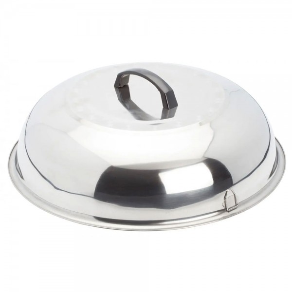 Use this 17-3/4" wok cover to keep your dish hot or prevent oil from splattering when sauteing. For added convenience, this wok cover is built with a comfortable handle for easy placement and removal. Made from rust-resistant stainless steel, this mirror-finished cover is easy to clean and will withstand the rigors of a commercial kitchen.
