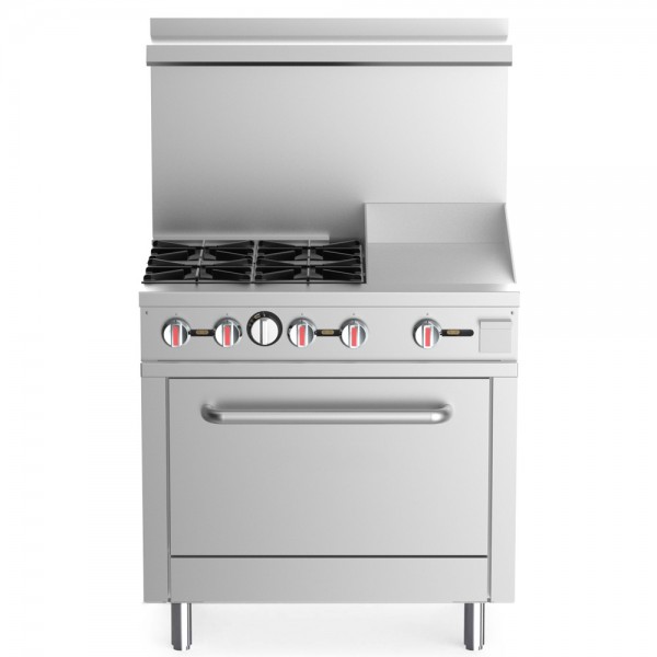 The Wowcook commercial range with griddle is everything you need to streamline cooking operations in your Kitchen. It features a 12" and 3/4" thick griddle where you can grill a range of products. Each burner has a heavy duty cast iron grate that conveniently supports your fry pans, sauce pans, and other commercial cookware. With a 250F to 550F adjustable temperature range, you have enough leeway to accommodate any recipe in your oven - whether you are looking to bake a cake or roast a chicken. 2 chrome plated racks included in oven can be arranged in four configurations for greater flexibility. Bring long term reliability and durability to your commercial kitchen with the Wowcook 4 burner range