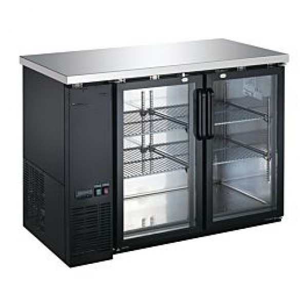 Description Store and display refrigerated beer bottles and beverages behind your bar with this narrow depth 48" undercounter back bar cooler with glass doors. At only 24" front to back, this commercial beer bottle refrigerator will fit perfectly into a bar with limited space, while providing ample storage with its 13 cu. ft. capacity. The heavy duty 304 stainless steel top makes this beer cooler great to use as a worktop refrigerator, and the front breathing compressor allows it to install safely under any counter or bar. All back bars come with interior LED lighting and optional casters are available. Wowcooler back bar refrigerators available in 48, 60, 72" lengths, with swing or sliding glass doors, or with solid black doors.