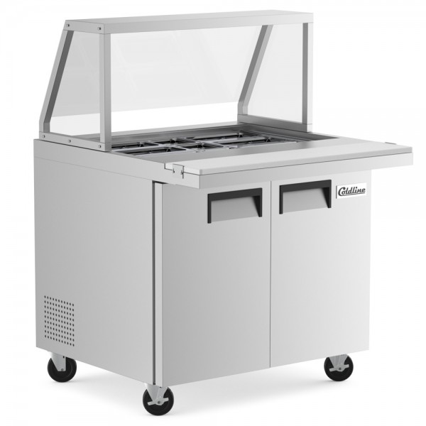 The SMB36 inch glass top salad bar refrigerator fits 9 pans (Sold Separately) and includes a full length 8 inch cutting board included standard. Stainless steel interior and exterior for long lasting durability and easy cleaning. The 1/4+ HP refrigeration system will keep your food in the safe zone while the self-closing doors lock the cold air at 9 cu. ft. of storage offers plenty of room for storage and 2 adjustable 90 lb. shelves allow you to organize optimally. A vented stainless steel vented divider ensures your top food section and bottom storage section remain completely separate, a health code requirement in many states.
